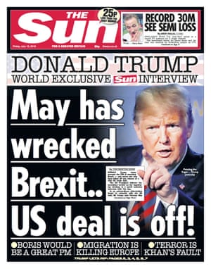 En los jardines de la residencia campestre de los primeros ministros británicos, Chequers, Donald Trump y Theresa May asistieron a una conferencia de prensa conjunta que tenía como trasfondo la entrevista que Trump había dado al tabloide The Sun. En ella, el Presidente de Estados Unidos había cuestionado a May de muchas maneras posibles: aseguró que la había aconsejado de cómo proceder en el Brexit, agregó que ella se había ido en la dirección opuesta a ese consejo, anunció que cualquier acuerdo comercial entre ambos países estaría liquidado con ese tipo de Brexit y ensalzó al renunciado ministro de Relaciones Exteriores Boris Johnson —rival interno de May en el Partido Conservador— como un potencial “gran” primer ministro.