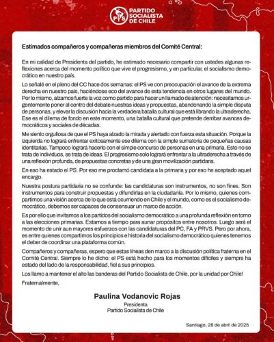 Paulina Vodanovic, presidenta del Partido Socialista, anunció a través de una carta, su renuncia a la candidatura presidencial, llamando a los partidos del socialismo democrático a construir una plataforma común de cara a las primarias del 29 de junio. La decisión deberá ser ratificada este lunes por el Comité Central de la colectividad.