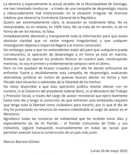 Barraza aseguró que su decisión busca evitar cualquier efecto negativo en el Gobierno del Presidente Gabriel Boric y en la labor del Ministerio del Trabajo. “No estoy disponible a que esta operación política afecte al Gobierno ni al Ministerio. Por eso, hoy presenté mi renuncia”, agregó.