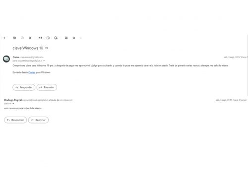 Uno de los casos fue expusto por un usuario de Reddit hace tres años, mencionando que compró una licencia de Windows 10 Pro, reclamó porque no le funcionó y le respondieron con un desagradable mail: “esto no es soporte, imbécil de mierda (sic)”.
