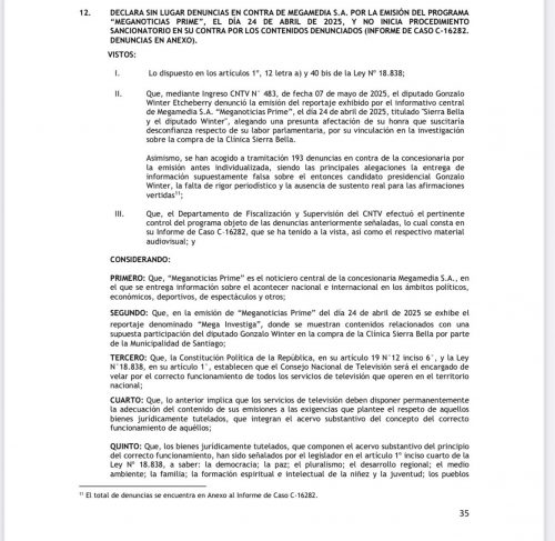 Sin embargo, el CNTV desestimó su denuncia. En el acta de su sesión del 30 de junio, un día después de la primaria donde Winter quedó tercero, el organismo concluyó que el reportaje no vulneró las normas legales ni constitucionales que rigen a los canales de televisión.