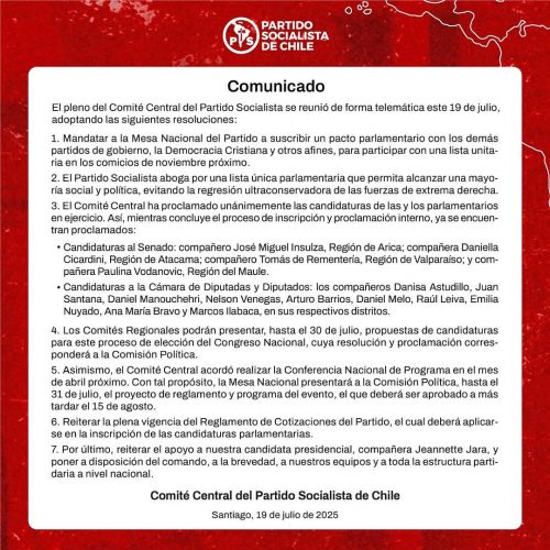Además, en la misma instancia, el PS confirmó la reelección de los diputados Nelson Venegas (distrito 6) y Arturo Barrios (distrito 7), reiteró su respaldo a la candidatura presidencial de Jeannette Jara y reafirmó su apuesta por una lista unitaria del oficialismo.