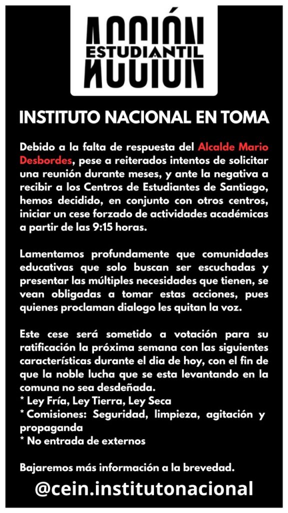 A través de un comunicado difundido en redes sociales, el Centro de Estudiantes del Instituto Nacional (CEIN), explicó que la medida corresponde a “un cese forzado de actividades académicas”, ante la negativa del municipio de recibir a representantes estudiantiles durante la jornada del jueves.