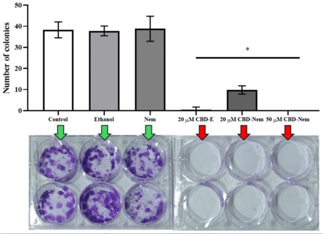 Los ensayos in vitro demostraron nanoemulsión del cannabidiol no solo redujo la viabilidad de células cancerígenas, sino que también inhibió su capacidad de migrar e invadir otros tejidos, un factor fundamental en el proceso de metástasis. Además, disminuyó la formación de colonias tumorales durante 20 días, mostrando un efecto prolongado.