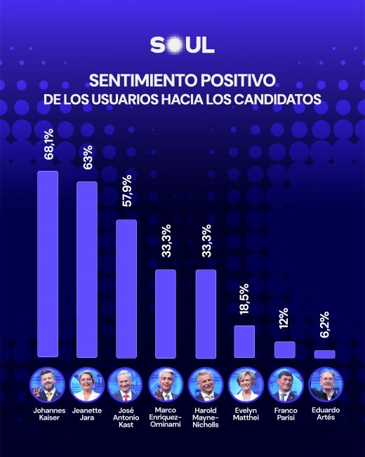 En materia de sentimiento, Johannes Kaiser fue el mejor evaluado con 68,1% de menciones positivas, seguido de Jara (63%) y Kast (57,9%).