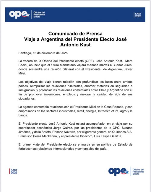 El Presidente electo de Chile, José Antonio Kast, viajará este martes a Buenos Aires, Argentina, para reunirse con el mandatario de ese país, Javier Milei.