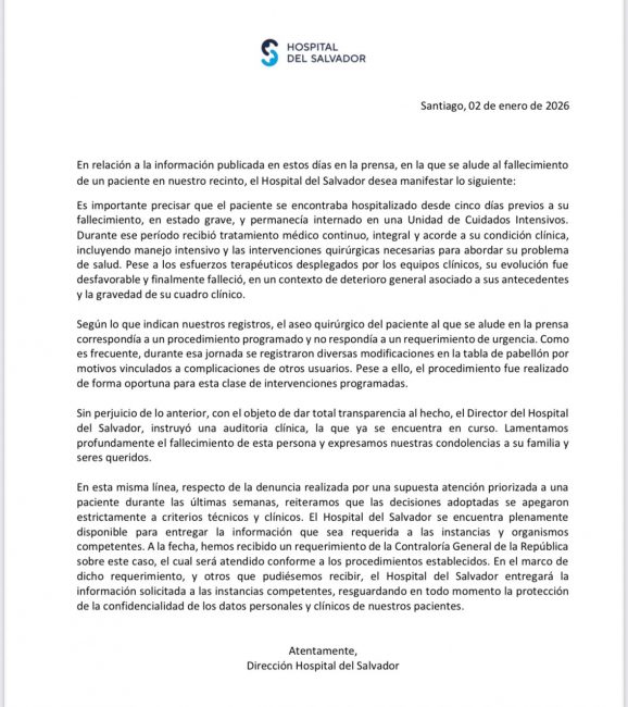 Con el objetivo de asegurar total transparencia, la dirección del Hospital del Salvador informó que su director instruyó una auditoría clínica, la cual ya se encuentra en desarrollo.