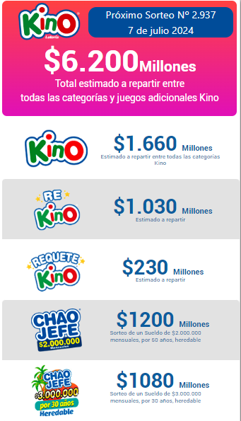 El sorteo 2937 del Kino y los demás premios de Lotería como “Rekino”, “Chao Jefe” y “Chanchito Regalón” se llevará a cabo este domingo 07 de julio a partir de las 22:30 horas.