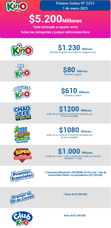 Rekino, los diversos Chao Jefe, Chanchito Regalón y Combo Marraqueta, entre otros, cuyos premios a repartir superan los $5.200 millones de pesos.