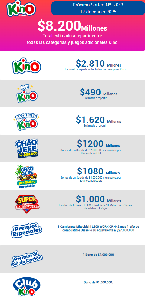 El pozo acumulado y a repartir para el sorteo de este miércoles 12 de marzo del Kino, sorteo número 3.043, es de $8.200 millones de pesos.