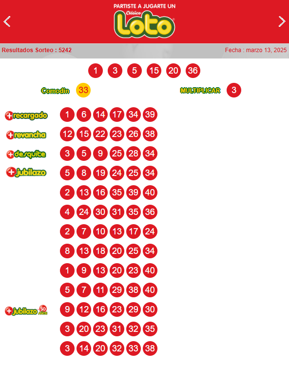 Resultados del Loto sorteo 5242: números ganadores del jueves 13 de marzo de 2025. A continuación, los resultados oficiales: