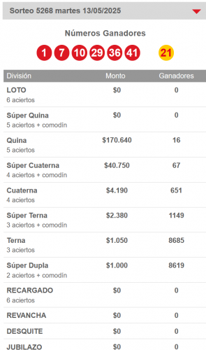 Resultados Loto: sorteo 5268 del martes 13 de mayo
