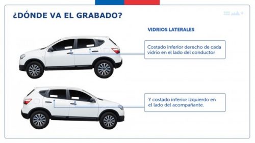 El grabado debe estar presente en al menos seis vidrios (laterales, luneta y parabrisas), además de los 2 espejos laterales. En casos de que el vehículo contenga más (ejemplo, furgones o buses), sólo se exigirá el mínimo.