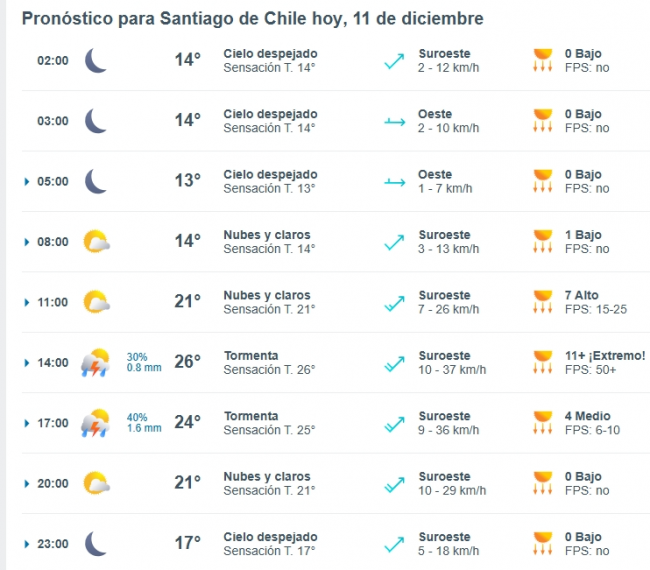 De acuerdo con Meteored, la lluvia y tormenta eléctrica llegarán a Santiago alrededor de las 14:00 horas, con una fase inicial débil durante la tarde.