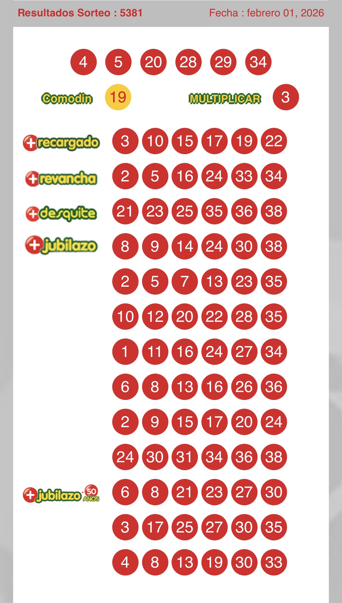Resultados del Loto hoy: domingo 1 de febrero sorteo 5381