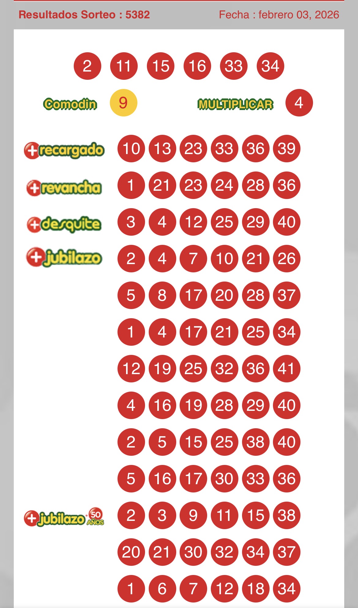 Resultados del Loto, sorteo 5382: martes 3 de febrero