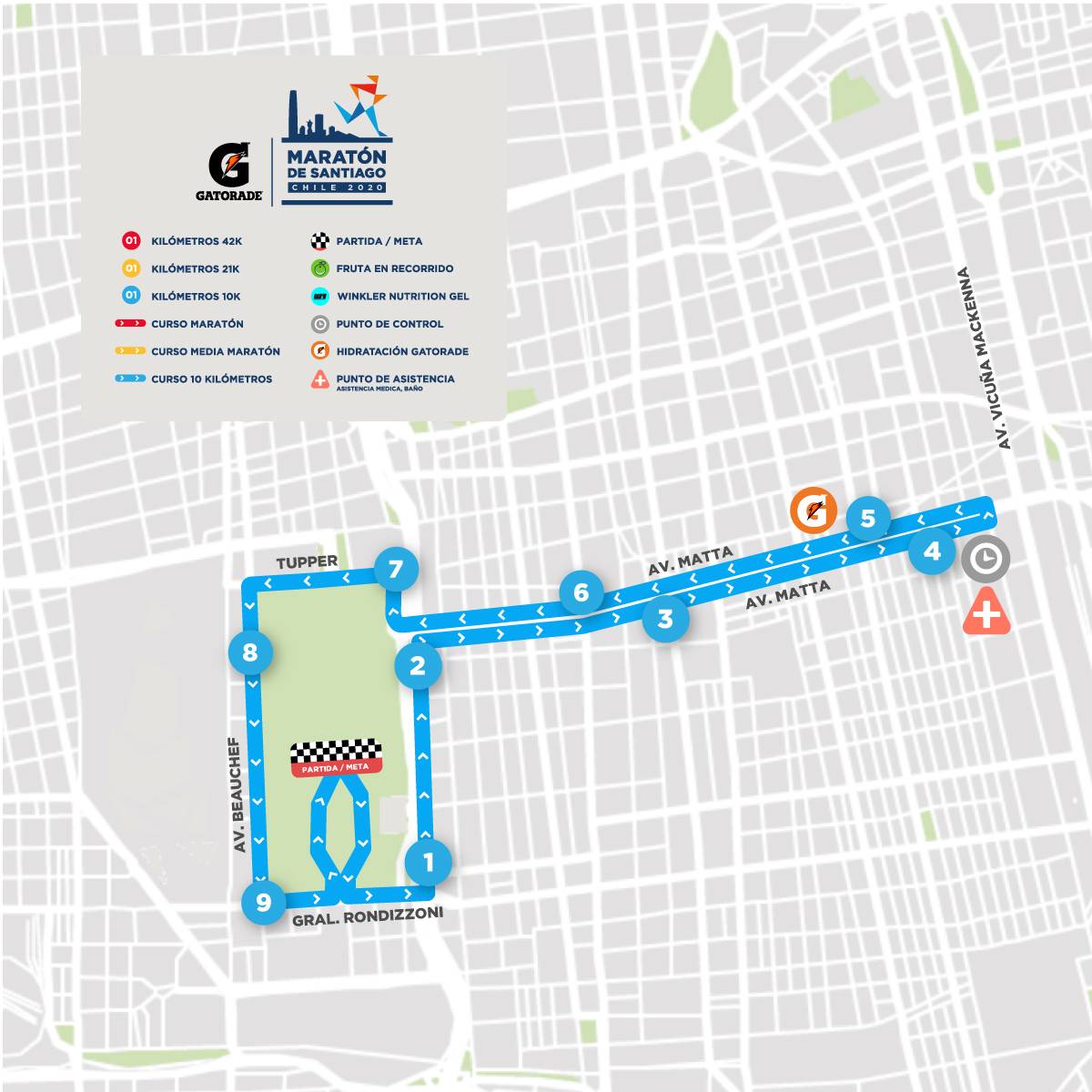En esta edición, el maratón estará presente en las comunas Santiago, Ñuñoa, Providencia, La Reina, Peñalolén, Las Condes y Vitacura. Serán tres los recorridos: el de 10K, el de 21K y el de 42K, y sus horarios de largada son desde las 8:30 horas en partidas diferidas.