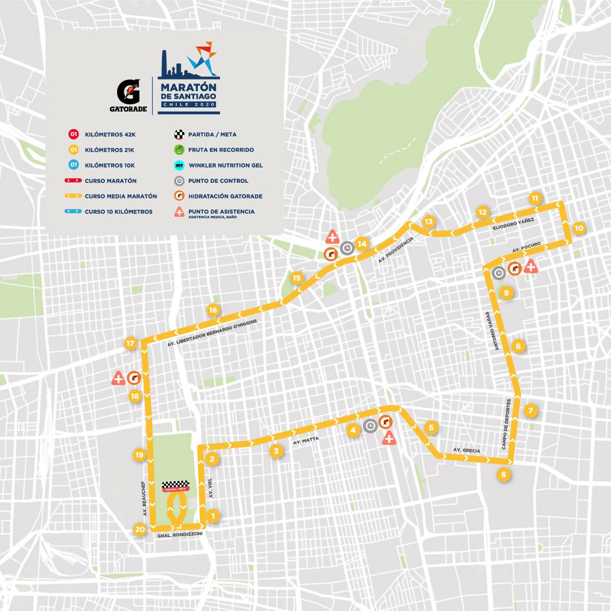 Esta media maratón inicia a las 7:40 horas, en distintas partidas (diferidas). Esta carrera de los 21K del Maratón de Santiago también tendría inicio y meta en la elipse del Parque O’Higgins.