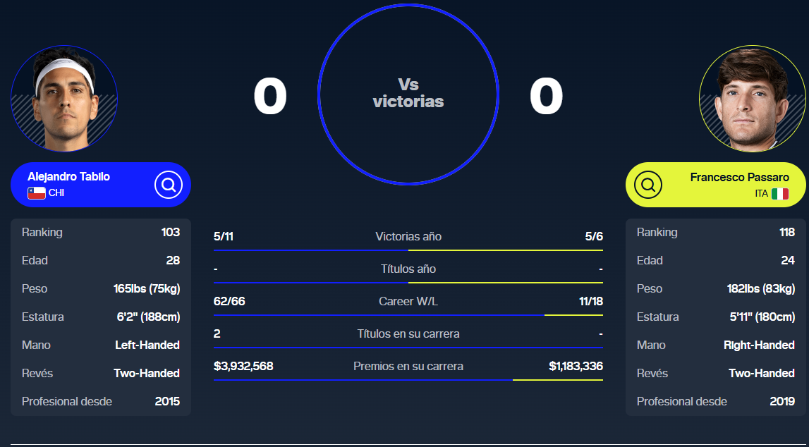 Ambos tenistas nunca se han enfrentado en algún torneo oficial. Revisa a continuación el Head2Head de Tabilo vs Passaro: