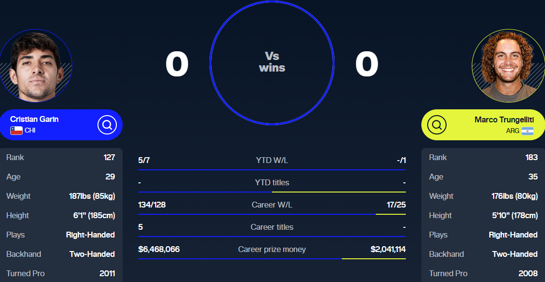 Ambos tenistas nunca se han enfrentado en un torneo oficial. Revisa a continuación el Head2Head de Garin vs Trungelliti: