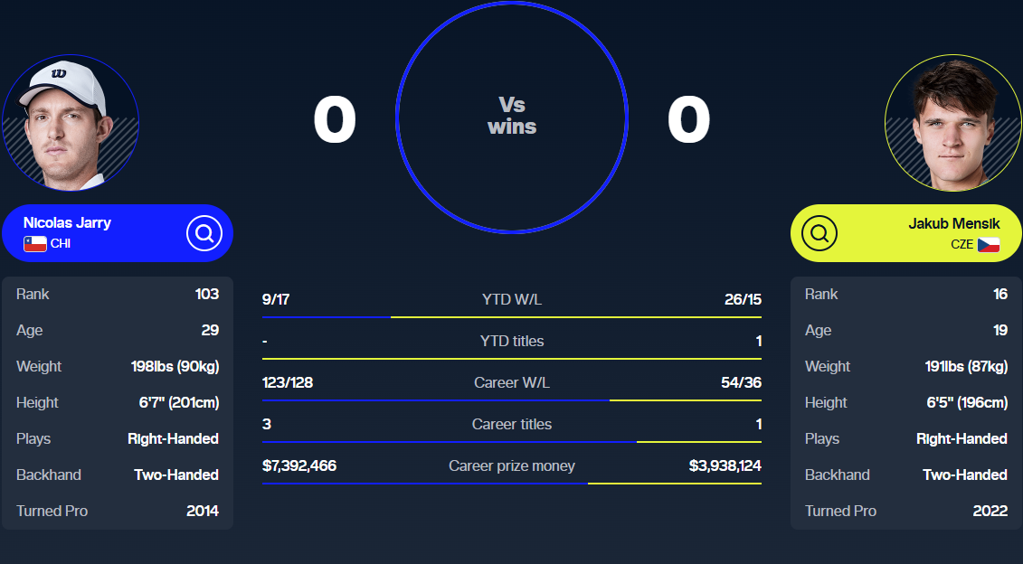 Ambos tenistas nunca se han enfrentado en un torneo oficial. Revisa a continuación el Head2Head de Jarry vs Mensik.