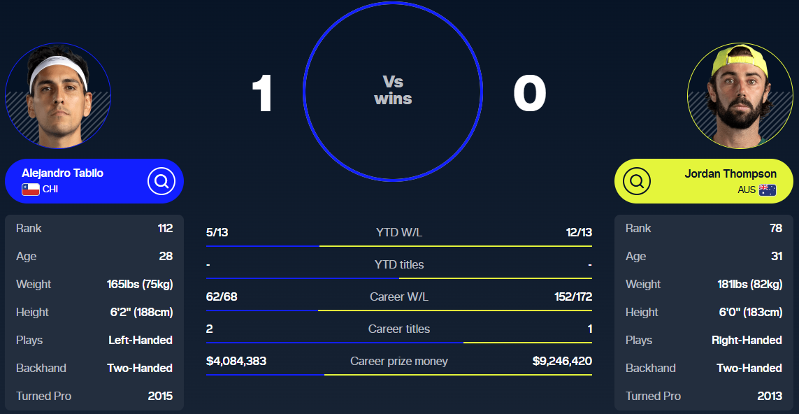 Ambos tenistas nunca se han enfrentado en algún torneo oficial. Revisa a continuación el Head2Head de Tabilo vs Thompson:
