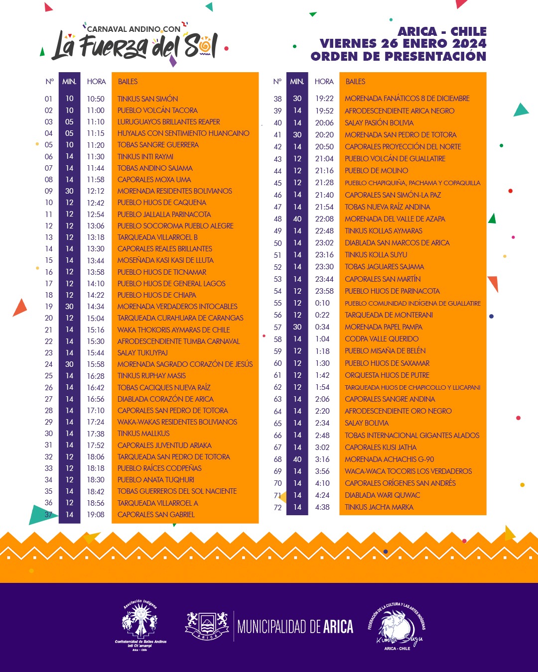 Revisa la calendarización completa del Carnaval de Arica 2024 del día 26 de enero.