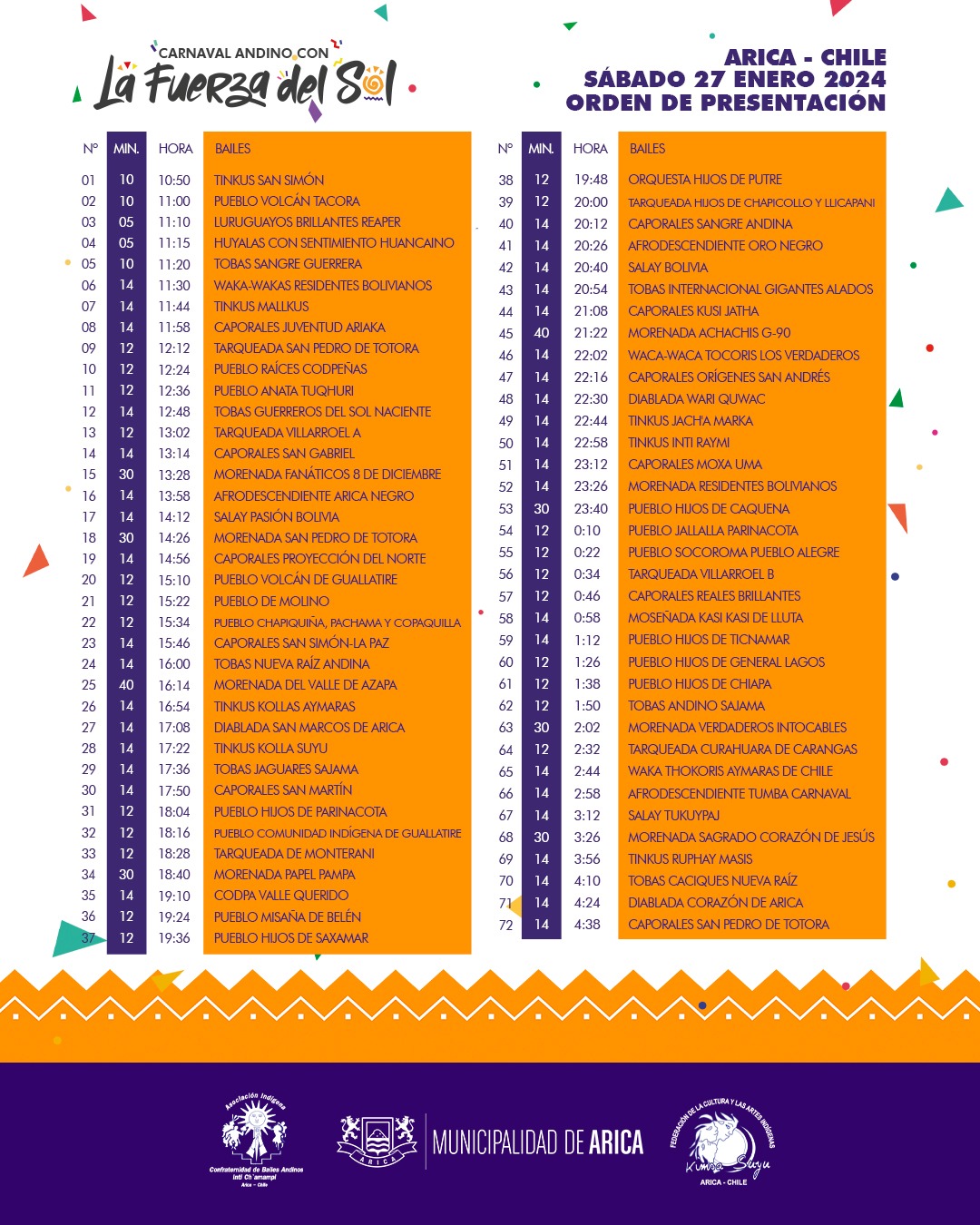 Revisa la calendarización completa del Carnaval de Arica 2024 del día 27 de enero.