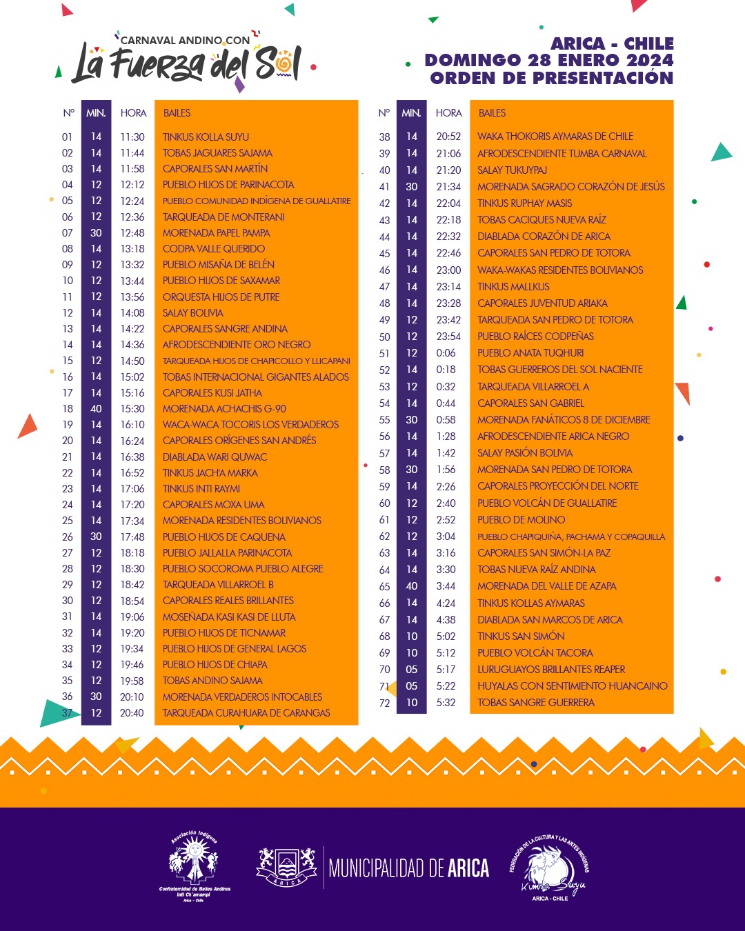 Revisa la calendarización completa del Carnaval de Arica 2024 del día 28 de enero.