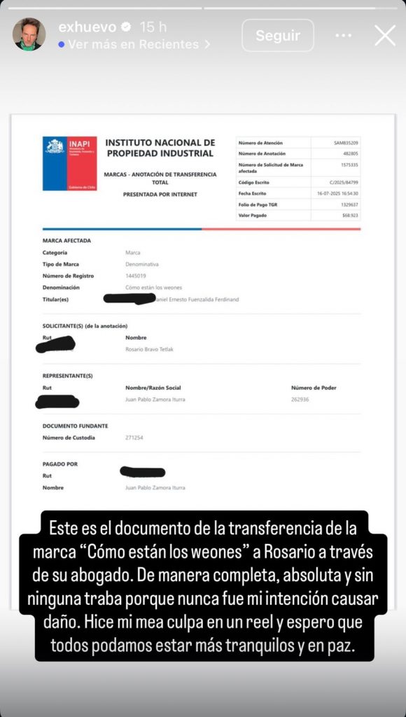 Con una publicación en sus redes sociales, Daniel “ex Huevo” Fuenzalida demostró a sus seguidores que transfirió la marca del podcast “¿Cómo Están Los Weones?” a su cocreadora Rosario Bravo, quien destapó esta polémica tras declarar que el animador hizo esto sin su autorización.
